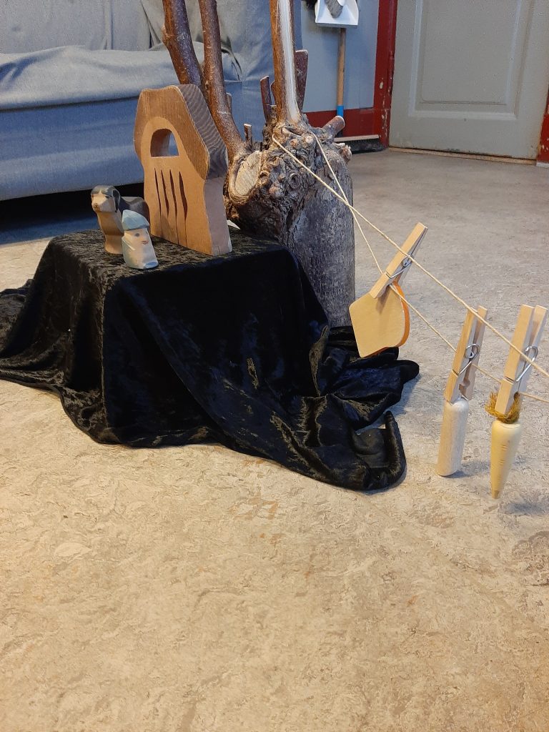 Eksempelvis ligesom her, hvor jeg har lavet en bordfortælling, som børnene kan genskabe. Det kunne også være oplæsning af bøger, hvor børnene kan genfortælle ud fra billederne.